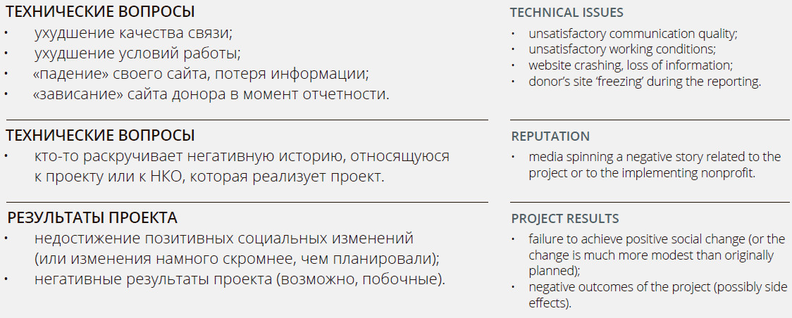 Each risk in the list above is an actual problem reported by Russian nonprofits from their experience. Therefore, we assume these can happen to you just as well. So when you are done designing your project, you can go through the list and try to answer the following questions: