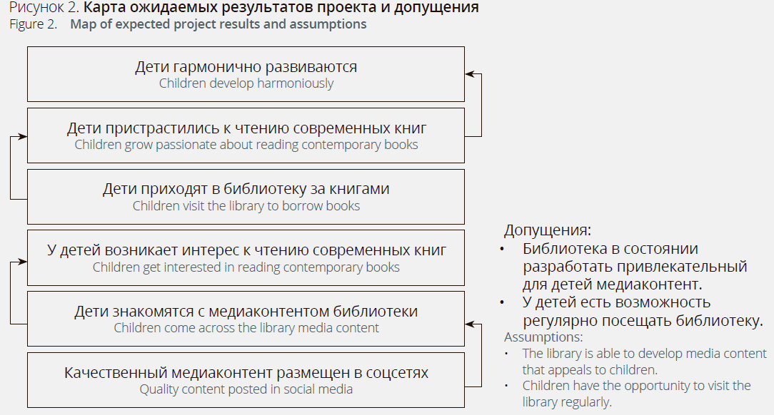 Теория изменений показывает, каким образом и почему деятельность в рамках проекта должна привести к достижению запланированных результатов (Кузьмин, 2014). Обязательными компонентами теории изменений являются карта ожидаемых результатов и допущения.