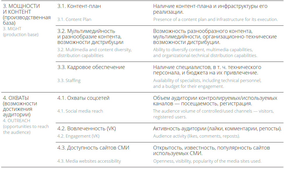Каждый из параметров в каждой группе может быть оценен по шкале от 1 до 3, где 1 — наименьший балл, 2 — средний балл, а 3 — высокий. Соответственно, чем выше балл, тем лучше представлен у медийной команды тот или иной параметр. Оценки в каждой группе суммируются, но есть еще поправочные коэффициенты, связанные с численностью жителей городов. Поправочный коэффициент необходим, чтобы более справедливо сравнивать города, где живет 30 тыс. человек, с городами, где население больше 100 тыс.