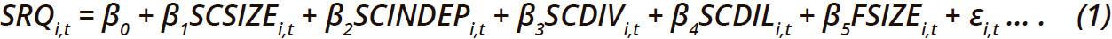 According to Table 3, the coefficients for SRQ’s positive relationships with SCSIZE, SCINDEP, SCDIL, and CSIZE are 0.147, 0.344, 0223, and 0.472, respectively; at the same time, SCDIV has a negative value of -0.007. However, only the associations with SCINDEP, SCDIL and CSIZE are significant. In addition, all the explanatory and control variables have moderate-to-strong positive and significant association with each other, except for the two positive associations between CSIZE/SCSIZE and CSIZE/SCDIV (0.177 and 0.023 respectively) which are not significant. These coefficients indicate that improvements in sustainability committee attributes are positively correlated to each other. Additionally, the control variable CSIZE exhibits a positive correlation with every research variable, with coefficients ranging from a low of 0.0227 (SCDIV) to a high of 0.4715 (SRQ). This suggests that as a result of the increase in asset size for the companies, the quality of their sustainability reporting also rises.