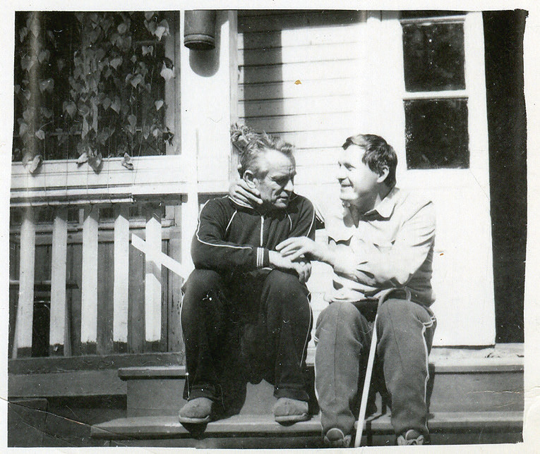 Философ Эвальд Ильенков и слепоглухой юноша Суворов сидят на трубе у бассейна «Чайка». Эвальд пальцем пишет по ладони Суворова строки из Галича: