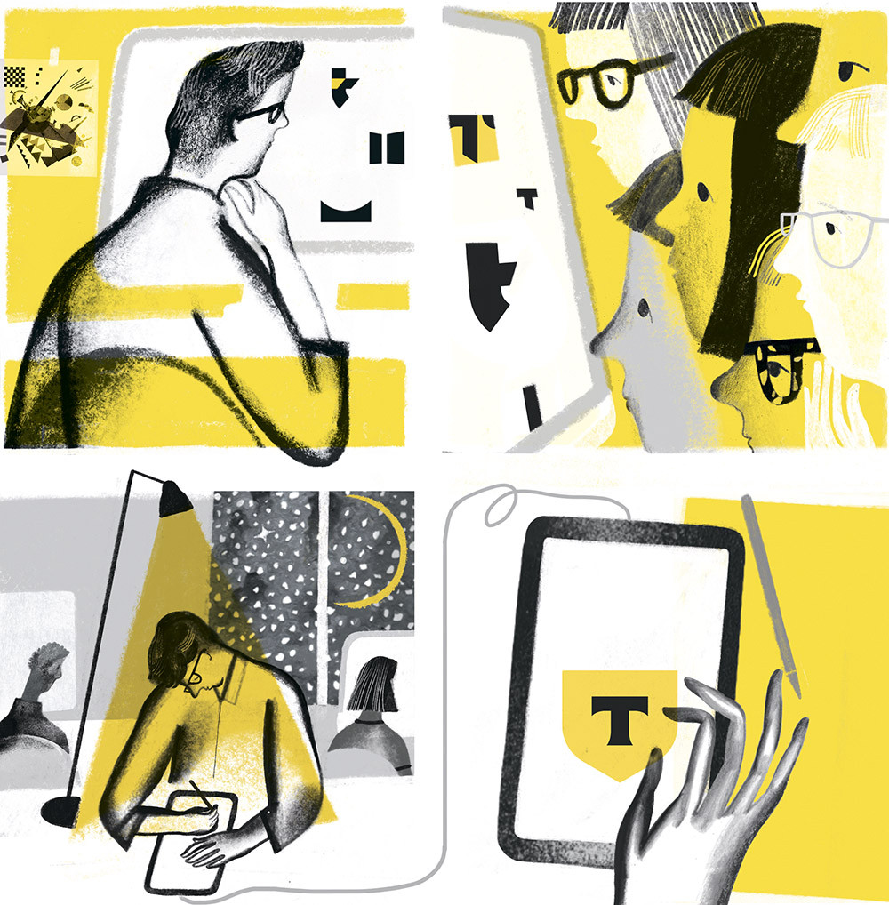 Разработка любой бизнес-идеи в компании начинается в том числе с дизайна, будь то новый продукт в приложении или коммуникация с клиентом. «Есть бизнес-задача – дизайнеры что-то там порисовали, сделали презентацию, и мы сразу смотрим на конкретные картинки. Странно было бы обсуждать продукт для клиента, не видя, чем он будет пользоваться», – рассказывает Иван Турлаев, руководитель направления дизайна клиентских сервисов. Его дополняет Антон Смирнов, который отвечает за дизайн внутренних интерфейсов: «Вот я скажу слово “лук”, и кто-то представит репчатый, кто-то – лук, которым стреляют, а кто-то – лук, в который одеваются. И каждый уходит с планерки со своим представлением, о чем он договорился. Пока не появится в схеме дизайнер, который нарисует этот лук. Это будет стартовая точка, от которой мы оттолкнемся и полетим».