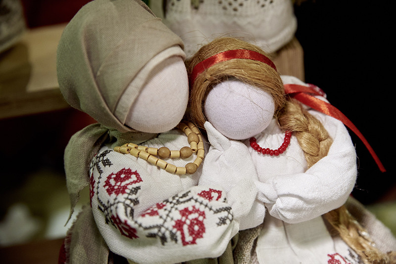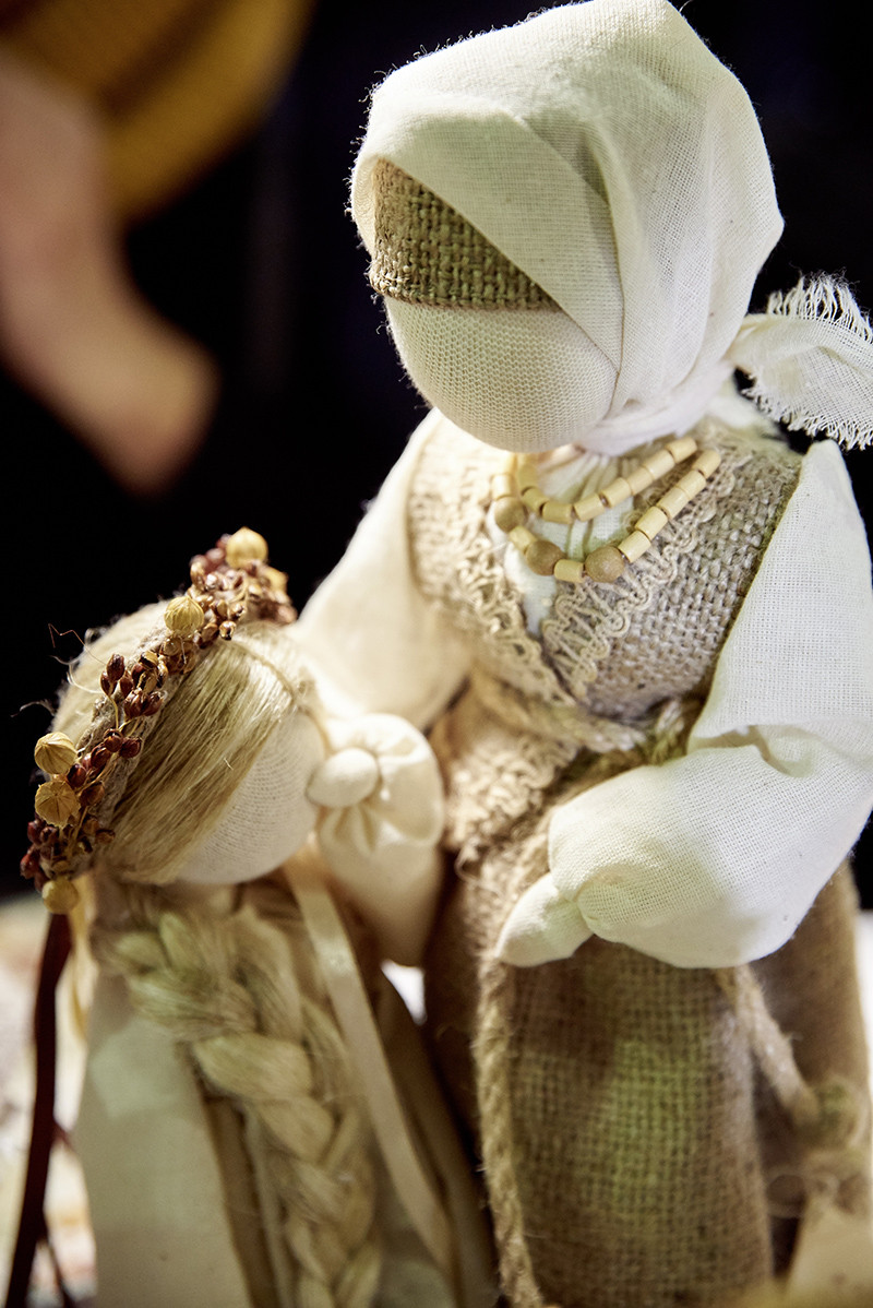 А.Б.: Мир кукол разнообразен. Каждая кукла для особого случая. Я приведу несколько примеров. Нам всем знакома Столбушка из сказки про Василису – кукла родительского благословения и символ поддержки и стойкости. В ее тулове ключевой элемент – столбец, а дополнительный – мягкие «живые» руки. Когда Василисе предстояло сложное задание, она кормила куклу, приговаривая «покушай, мое горе послушай», и та помогала. А самой первой куклой в жизни ребенка была Пеленашка, ее крутили при рождении младенца, – столбик размером с ладошку. Она помогает почувствовать себя живым. Если ее зажать в кулачке, через некоторое
