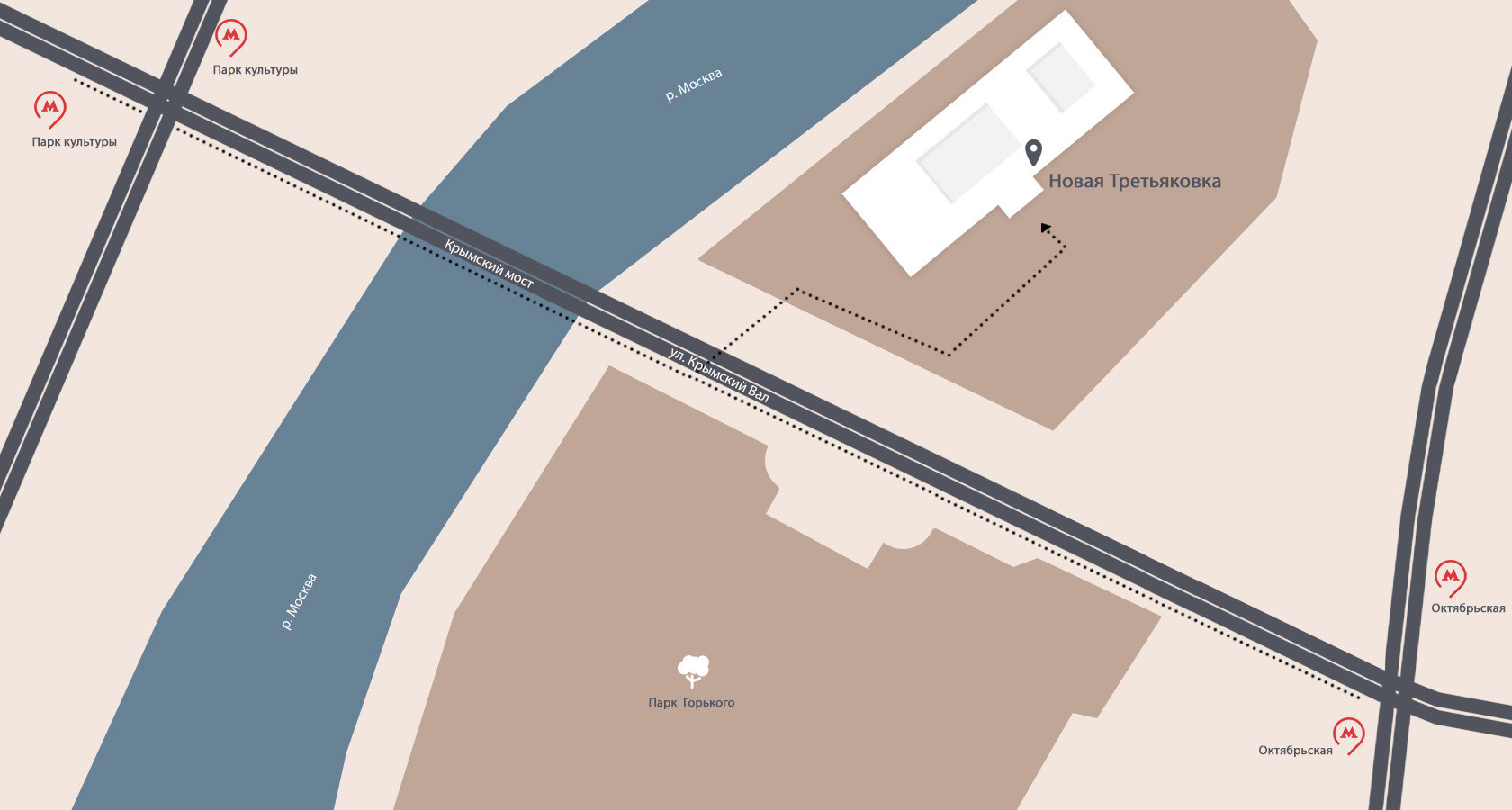 Добираться до Новой Третьяковки удобнее всего на метро. Ближайшие к ней станции — «Парк культуры» и «Октябрьская». От метро вы дойдете до музея по улице Крымский Вал за 10−12 минут.