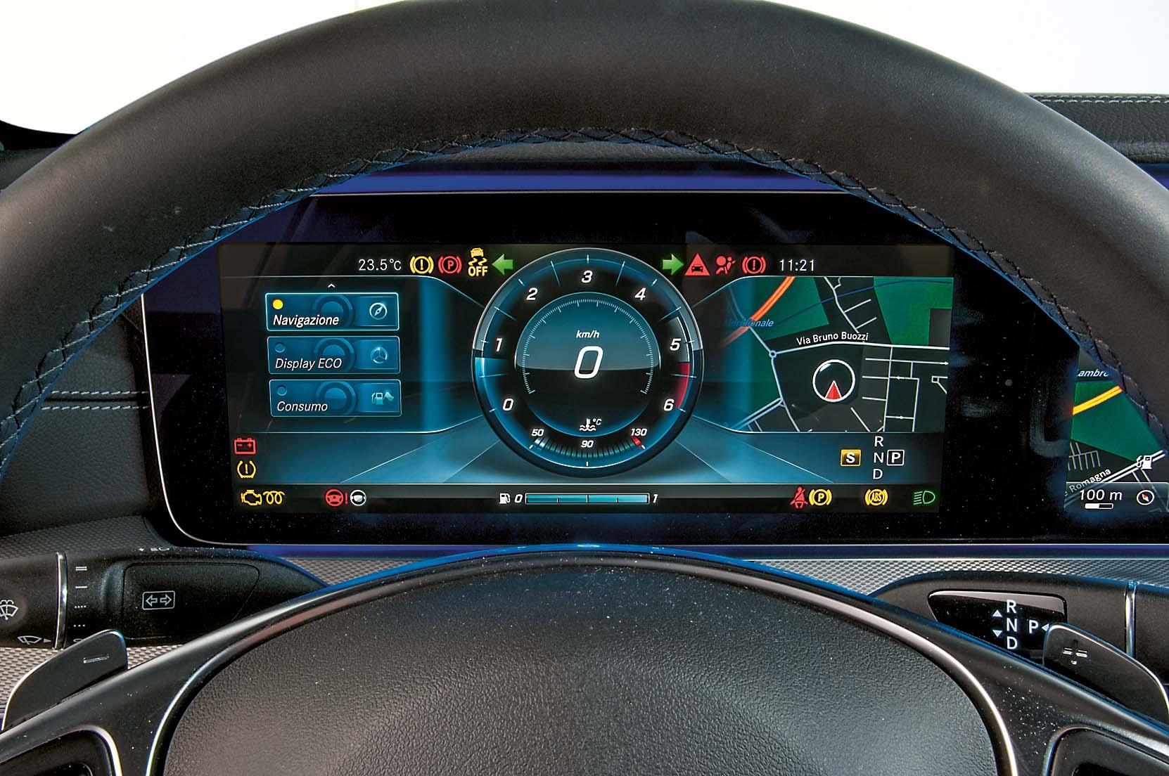 Центральная часть обивки сиденья выполнена из микрофибры: смотрится спортивно, сидишь правильно, глубоко, боковая поддержка вполне достаточная. Если углубиться в многостраничный список опций, можно обнаружить множество вариантов обивки, электрических регулировок, систем обогрева и вентиляции. Отделан салон очень тщательно, как того и требуют традиции Mercedes. Нам, например, понравилось, как искусственная кожа сочетается с «техническими» материалами, в частности, с алюминием, использованным в отделке некоторых деталей. Цветовая гамма тоже подобрана удачно, она создает шикарную, мягкую атмосферу. Ночью цвета подчеркивает светодиодная подсветка, элегантная и мягкая (оттенков на выбор множество). Места вполне достаточно, по крайней мере, спереди. На заднее