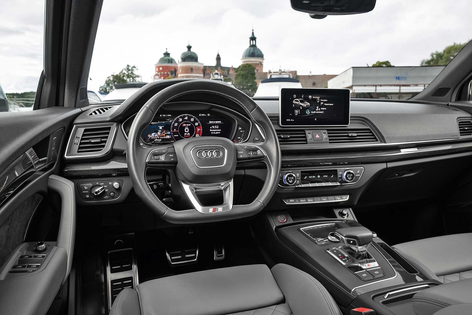 Внутри – виртуальный приборный щиток (опция), внушительных размеров экран MMI с навигацией (тоже опция). Инженеры Audi, безусловно, нашли оптимальный баланс между количеством физических клавиш и интуитивно понятным интерфейсом. Все в салоне устроено, как у моделей Аudi последнего поколения. Ну или почти все. Дефлекторы, например, совсем незатейливые. Помните, какие у ТТ – круглые, в авиационном стиле, а какие у А4 – во всю ширину передней панели? Так вот ничего близкого в новом Q5 нет и в помине.
