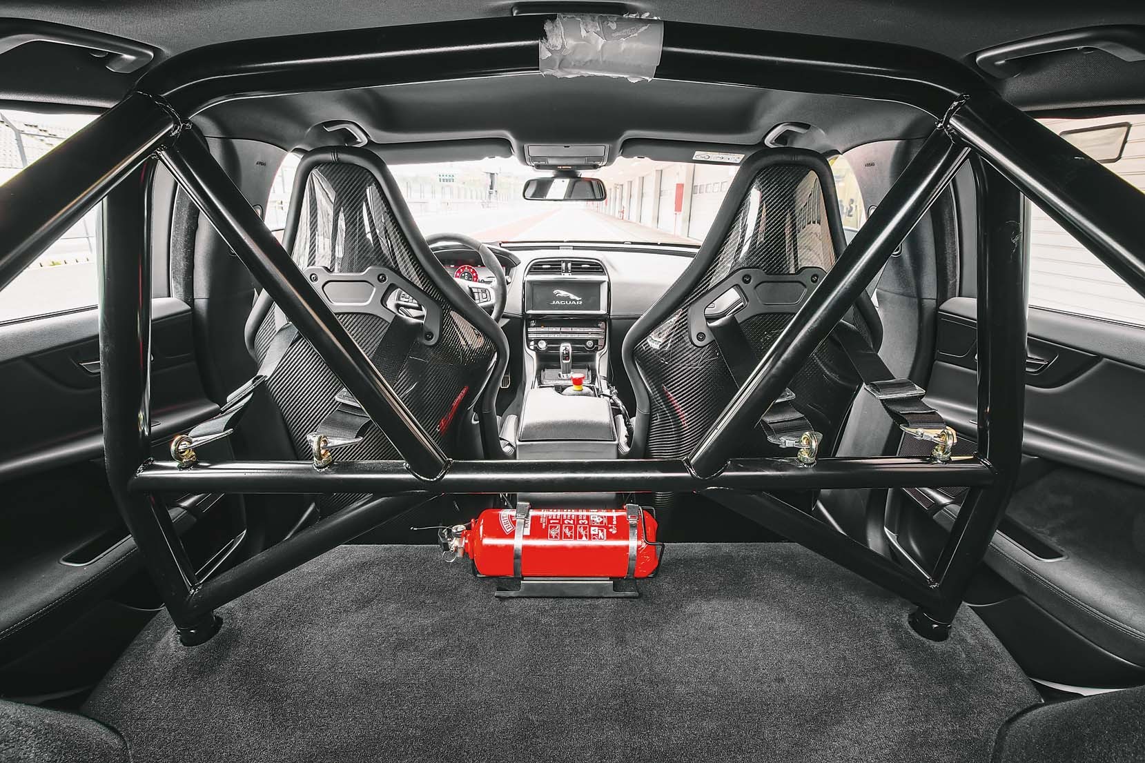 В основе проекта — серийный XE. От него сохранился алюминиевый силовой каркас, компоновка и часть интерьера. Остальное — все остальное — подвергли доработкам или спроектировали с нуля специалисты подразделения SVO (Special Vehicle Operations). Наибольшее внимание уделили ходовой части и аэродинамике. В подвеске — сдвоенные пружины, предусмотрена возможность опустить автомобиль на 15 мм для езды по треку. Колеи стали шире на 24 мм спереди и на целых 73 сзади. Автомобиль обут в специальные шины Michelin Sport Cup 2, за замедление отвечает углекерамическая тормозная система. Про аэродинамику вы можете прочитать, перевернув странцу, — мы подробно рассказали, что сделали инженеры, чтобы гарантировать устойчивость в том числе и на очень высоких скоростях (максимальная достигает 332 км/ч).