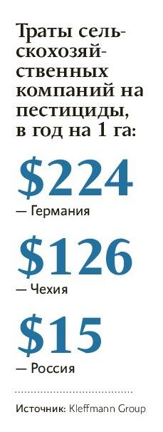 Увеличивать закупки есть куда: в России в пересчете на 1 га используется на порядок меньше пестицидов, чем в Европе. В Германии сельхозпроизводители тратят на средства защиты в среднем по $244 на 1 га, в Чехии — $126, в России — не более $15, отмечают эксперты компании Kleffmann Group. Объем отечественного рынка в 2015 году Усков оценивает в $1,2 млрд, еще в 2011-м он не превышал $860 млн (данные Агростата). Мировой рынок за пять лет вырос почти на 40%, до $60 млрд (данные Syngenta).
