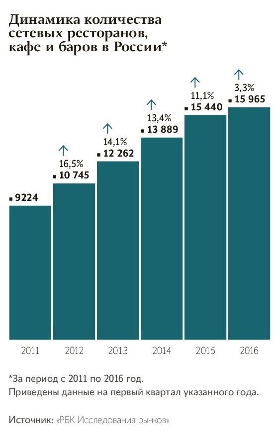 С мая 2015 года по май 2016-го российский рынок покинули 25 сетей, а прирост количества сетевых ресторанов составил 3,3% против 11,2% в 2013–2014 годах.