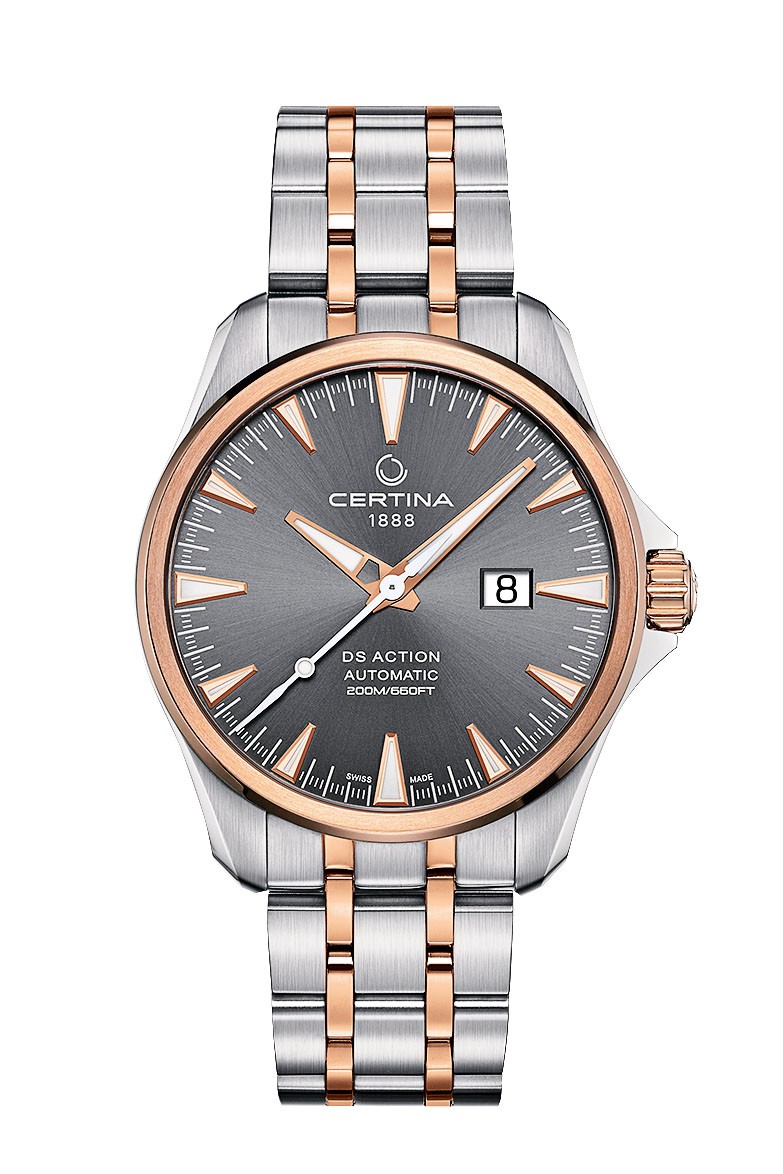 Ровно 130 лет назад братья Адольф и Альфред Курты основали часовую компанию в Гренхене. Латинский вариант названия швейцарского города — Grana — в начале XX века служил названием бренда. Но впоследствии было решено, что имя должно выражать идею надежности и долговечности часов: так, начиная с 1938 года фирма называется Certina. Важной вехой в истории компании стала разработка концепции DS (Double Security) в 1959 году: дополнительные элементыуплотнители помогли повысить ударопрочность и водонепроницаемость часов. Сегодня система «двойной надежности» используется во всех линейках Certina, а все модели отмечены аббревиатурой DS на фоне черепашьего панциря. Не стала исключением и новинка DS Action Big Date Automatic с крупным окном даты в позиции «3 часа». Автоматический калибр ETA 2826 надежно упакован в стальной корпус диаметром 41 мм, который обладает практически «дайверской» герметичностью — до глубины 200 м.