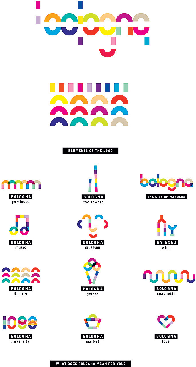 Простая система прямых и изогнутых линий в сочетании с определенной цветовой палитрой позволяет собирать пиктограммы, буквы и цифры для различных городских контекстов — от навигации и сувенирной продукции до обозначения достопримечательностей и логотипов мероприятий.