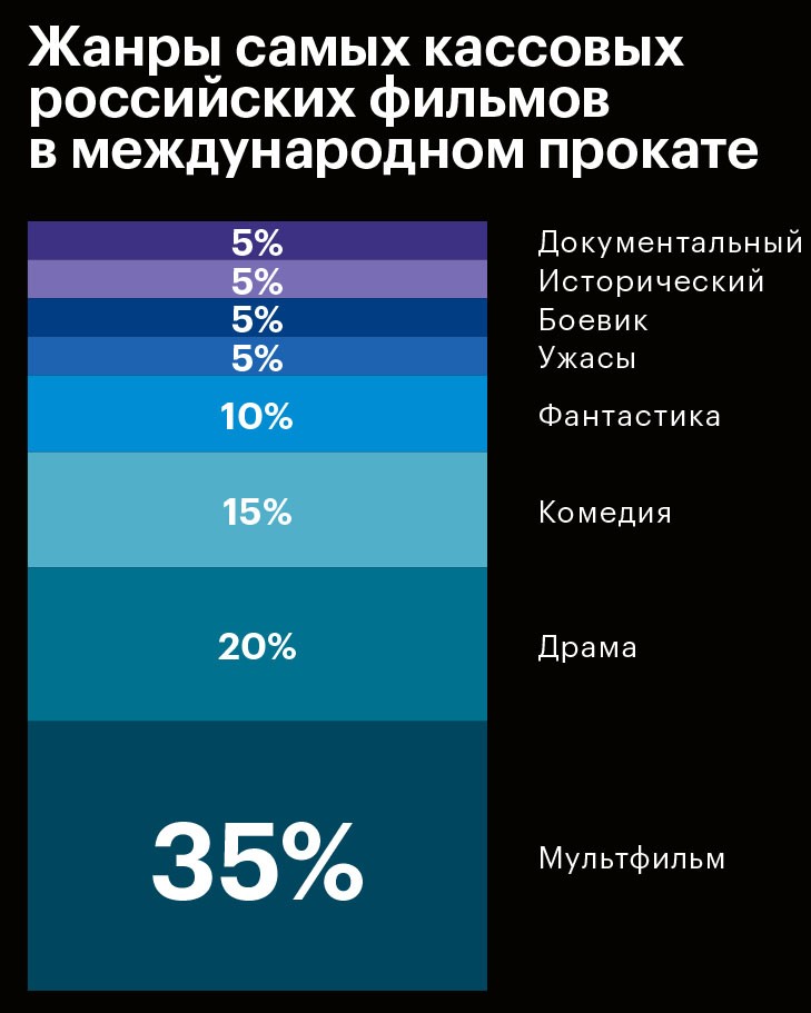 Кассовые рекорды российского кино на родине в последние годы затмили еще одну важную тенденцию — востребованность отечественной кинопродукции за рубежом. Вопреки стереотипам о низком качестве продукта сборы российских фильмов в зарубежном прокате в последние два года резко выросли — в 2016-м и 2017-м совокупный боксофис последовательно брал планку в $40 млн. С 2015-го этот показатель подскочил в четыре раза. Число российских фильмов в прокате за три года увеличилось на 44%, с 43 картин в 2015-м до 62 в 2017‑м. Журнал РБК изучил статистику, свидетельствующую о пока не сравнимых с Голливудом (до 80% бокс-офиса американских блокбастеров в последние годы приходится на зарубежные рынки), но уже ощутимых успехах российских фильмов за границей. Материал основан на данных доклада «Российская киноиндустрия — 2017», составленном Фондом кино и компанией InterMedia.