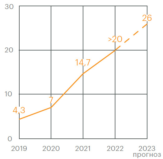 Уже по итогам того же 2020 года добыча выросла до 7 млн т против 4,3 млн т в 2019 году. В 2022-м добыли свыше 20 млн т, прогноз на 2023 год — 26 млн т.
