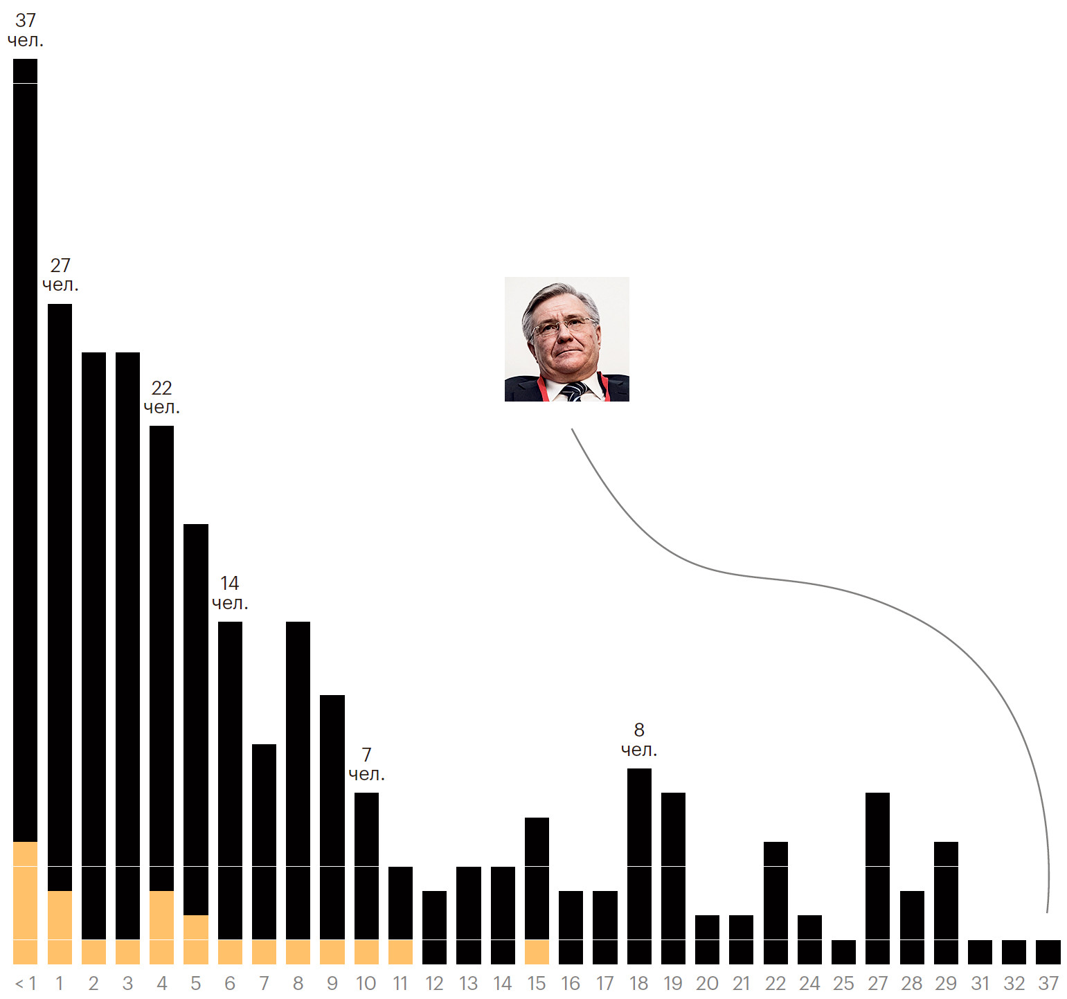 В сроках руководства крупнейшими компаниями по-прежнему наблюдается приоритет свежести над опытом. Нам удалось исследовать стаж руководства по данным 281 компании. Более половины руководителей рейтинга (54,8%) возглавляли компании не более пяти лет, при этом 13,2% управляют своим бизнесом менее года. Тем не менее в рейтинге есть и руководители, стоящие у руля компаний свыше четверти века.