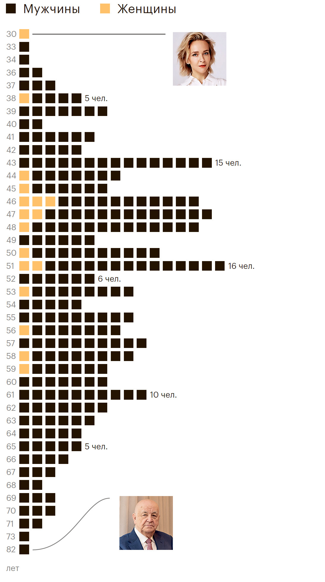 В этом году мы по традиции изучили, насколько зрелые и опытные люди руководят крупнейшими компаниями страны. Исследование проведено по данным о возрасте 261 руководителя компаний — участниц рейтинга. Наибольшему числу (6,1%) руководителей крупного бизнеса 51 год (в прошлом РБК 500 этот показатель составлял 44 года). При этом средний возраст руководителей компаний нынешнего рейтинга — 52 года. Столько же — 52 года — составляет разница между самым молодым и самым возрастным участником рейтинга. В возрастном диапазоне от 40 до 60 лет находятся 72,4% руководителей.