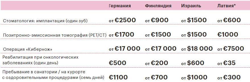Среди наиболее востребованных услуг, по словам руководителя кластера медицинского туризма Латвии Гунты Ушпеле, диагностические процедуры (в том числе высокотехнологичные), хирургия вен, пластическая хирургия, эстетическая дерматология. «Наша особая гордость — лаборатория глазного протезирования доктора Валдиса Валтерса, — рассказывает Гунта Ушпеле. — Лаборатория работает больше 25 лет, это единственная компания по глазному протезированию в странах Балтии. Глазные протезы делают вручную за один—три дня из немецких, американских, канадских материалов высшего качества. Стоимость протеза — от €350 до €1720». По данным компании MedRise, ориентировочная стоимость протеза в Германии — около €3000, в Турции — от €4500.