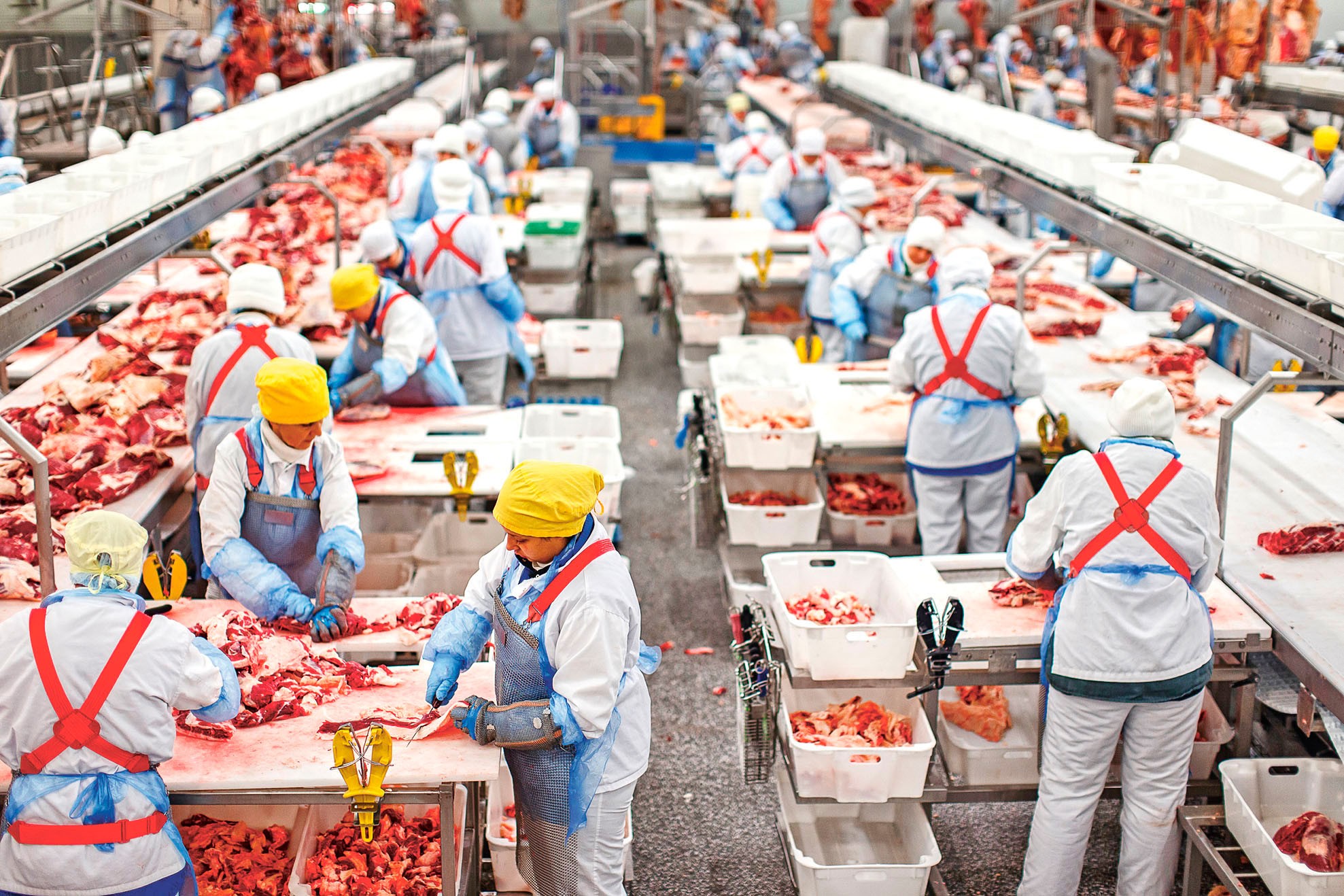 Конечная точка маршрута — мясоперерабатывающий завод мощностью до 100 т в сутки, сертифицированный по системам НАССР, ISO и «Халяль». Правила доступа на производство строже, чем в любой больнице. Снять часы и украшения, надеть стерильную одноразовую одежду, пройти через многочисленные камеры с дезинфекцией: пока в очередной раз не опрыскаешь руки обеззараживающим раствором, турникет не откроется. После всех процедур молодой улыбчивый технолог Анна ведет нас в гигантскую — на тысячу полутуш — холодильную камеру, где двое суток рядами зреет на крюках парное мясо. Оно должно остыть и покрыться тонкой корочкой, чтобы не испарялась влага.