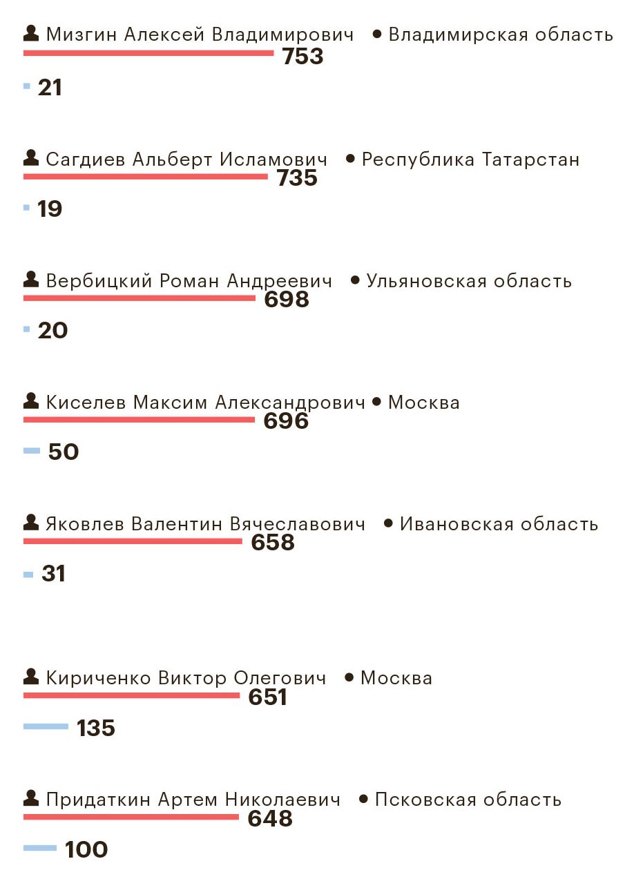 Большинство «номиналов» живут в Москве, но есть и жители других городов, например Роберт Садыков из Татарстана, Артем Придаткин из Пскова, Сергей Вакин из Пензенской области, Альберт Сагдиев из Казани — все они в десятке крупнейших «номиналов».