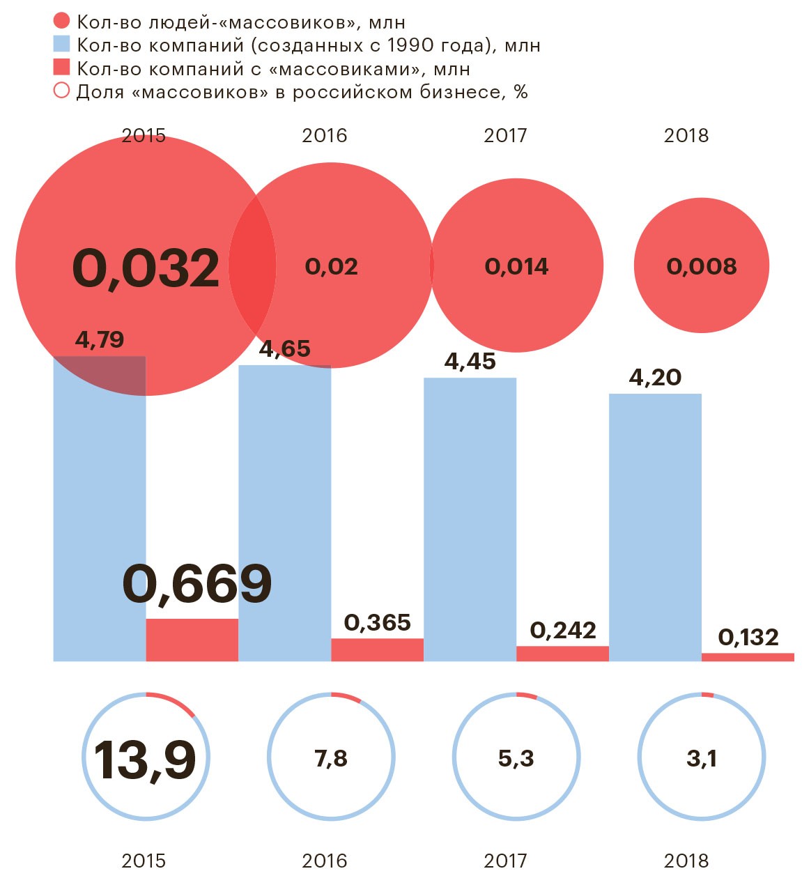 На октябрь 2018-го в России действовало 4,2 млн юридических лиц, из них 132,2 тыс. — с участием «номиналов», а самих «номиналов» — 8,7 тыс. человек, подсчитали аналитики проектного центра «Инфометр» специально для журнала РБК на основании данных с официального сайта ФНС. И это еще сравнительно немного, в 2015 году цифры были гораздо больше: 669,5 тыс. компаний (из 4,79 млн российских юрлиц) и 32,3 тыс. «массовиков» в роли совладельцев или генеральных директоров. Таким образом, если в 2015 году почти 14% российских компаний пользовались услугами «номиналов», то сегодня таких осталось 3,1%. Из-за ужесточения законов бизнес зицпредседателей «съеживается», но не исчезает — как выяснил журнал РБК, он подстраивается под новые требования рынка и успешно выживает.