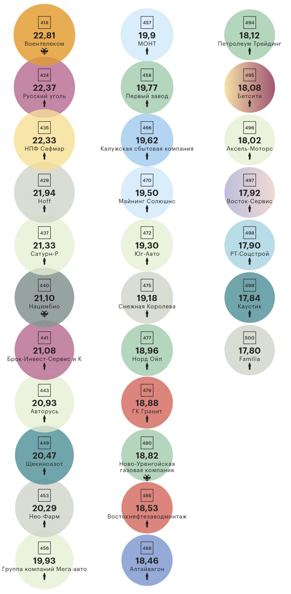 Лидером всего рейтинга по темпам роста стала упомянутая выше Кубанская нефтегазовая компания, за год увеличившая выручку на 1313%, с 4,8 млрд до почти 68 млрд руб. Это объясняется как эффектом низкой базы, так и неплохими показателями, позволившими компании попасть сразу во вторую сотню списка. Кстати, на втором месте по темпам роста еще один новичок рейтинга — Первый завод, новый частный нефтеперерабатывающий завод в Калужской области. В его случае высокие темпы роста — исключительно эффект низкой базы.