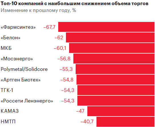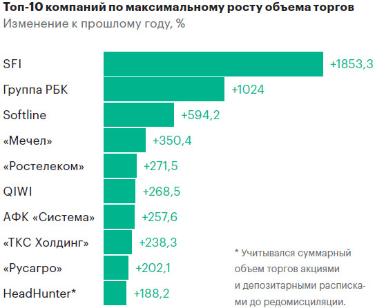 Наибольший рост объемов торгов за 12 месяцев, закончившихся в сентябре 2024 года, показали акции инвестхолдинга SFI («ЭсЭфАй», бывший «Сафмар Финансовые инвестиции»): объемы торгов ими выросли на 1853,3%, с 8,71 млрд до 170,2 млрд руб. Также акции SFI показали самый большой рост котировок — на 143,24%. «ЭсЭфАй» в текущем году начал достаточно активно работать над повышением собственной капитализации. В частности, компания погасила квазиказначейский пакет в 55% собственных акций, а также вывела свой ключевой актив в виде лизинговой компании «Европлан» на IPO», — объясняют аналитики «Финама». Также быстрый рост объемов торгов показали акции медиагруппы РБК — плюс 1024% (2,53 млрд против 28,39 млрд руб.) и IT-компании Softline — плюс 594,2% (14,02 млрд против 97,34 млрд руб.).