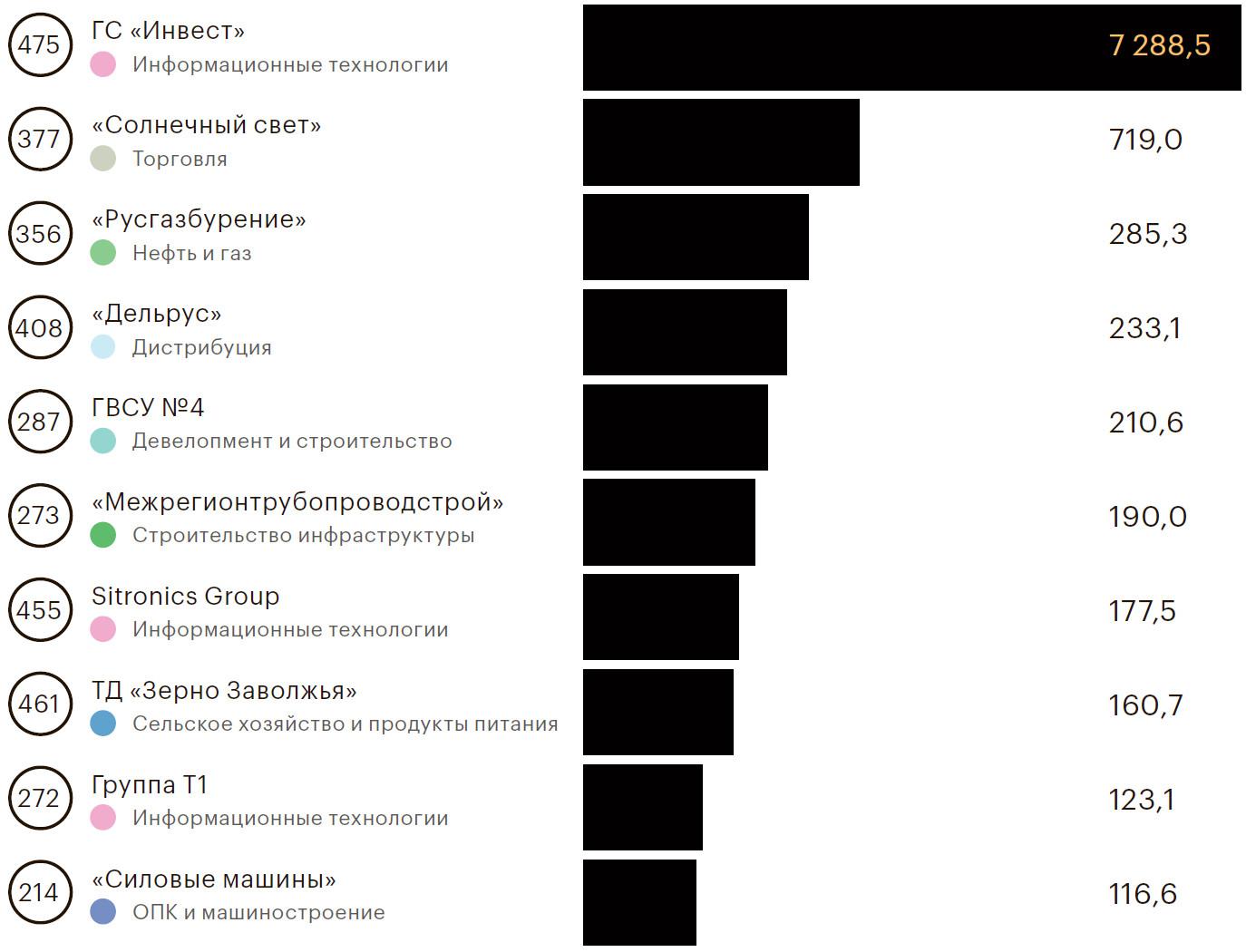 Самыми быстрорастущими отраслями в рейтинге РБК 500 за 2020 год оказались информационные технологии (плюс 30,7%), сельское хозяйство и продукты питания (плюс 23,6%) и фармацевтика (плюс 21,7%). Эти результаты сходятся с данными исследования рейтингового агентства НКР, в котором главными бенефициарами коронакризиса в России были названы фармацевтическая промышленность, сельское хозяйство, пищевая промышленность.