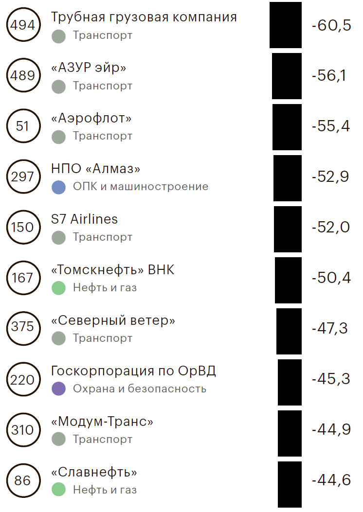 Снизилась выручка в пандемию в отраслях охраны и безопасности (минус 27,2%), нефти и газа (минус 24,2%), космической индустрии (минус 19,5%). Охрана и безопасность и космос—незначительные отрасли в масштабе РБК 500: первая представлена лишь тремя организациями с общей выручкой 128 млрд руб. (одна из них—«Охрана Росгвардии»), вторая—двумя предприятиями с общей выручкой 74 млрд руб.