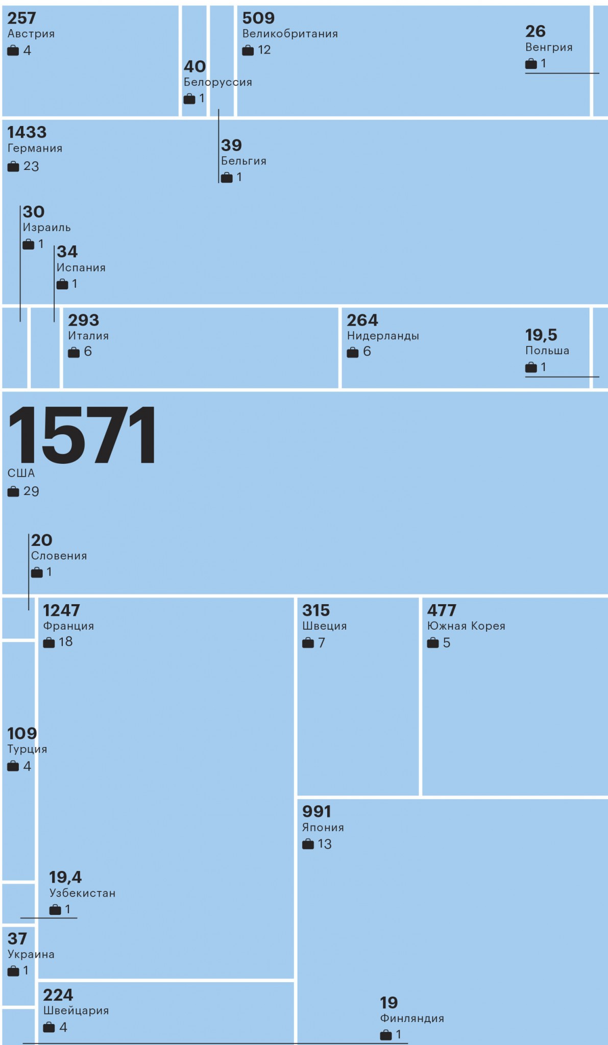 Больше всего среди иностранцев компаний из США — 29, у них же самая большая совокупная выручка — 1,57 трлн руб. На втором месте — Германия (23 компании и 1,43 трлн руб.), на третьем — Франция (18 компаний и 1,25 трлн руб.). Больше всего крупных иностранных компаний по-прежнему работают в отраслях «торговля», «с/х и продукты питания», «автомобили» и «фармацевтика». Крупнейшим новичком среди иностранцев стала «Техкомпания Хуавэй» (выручка в 2017-м — 61,7 млрд руб.), принадлежащая китайской Huawei Technologies.