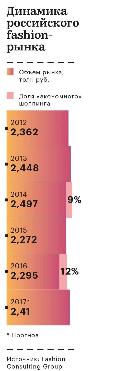 По словам гендиректора компании Y Consulting Дарьи Ядерной, в последние годы вырос еще и так называемый офпрайс-формат одежного ретейла, подразумевающий продажу остатков брендовой одежды со скидкой до 85%. Отчасти этому способствовал тот же кризис. «В 2015-м у массмаркета образовалось много остатков, поскольку коллекции, заказанные до обвала рубля, оказались невостребованы у покупателей по новым ценам. Это вынудило многих ретейлеров сдавать нераспроданную одежду в офпрайс-сети», — объясняет Ядерная. По ее оценке, доля «экономного шопинга» в 2016 году составила 12% от всех продаж на одежном рынке (около 356 млрд руб.). В 2014 году на них приходилось 9% рынка.