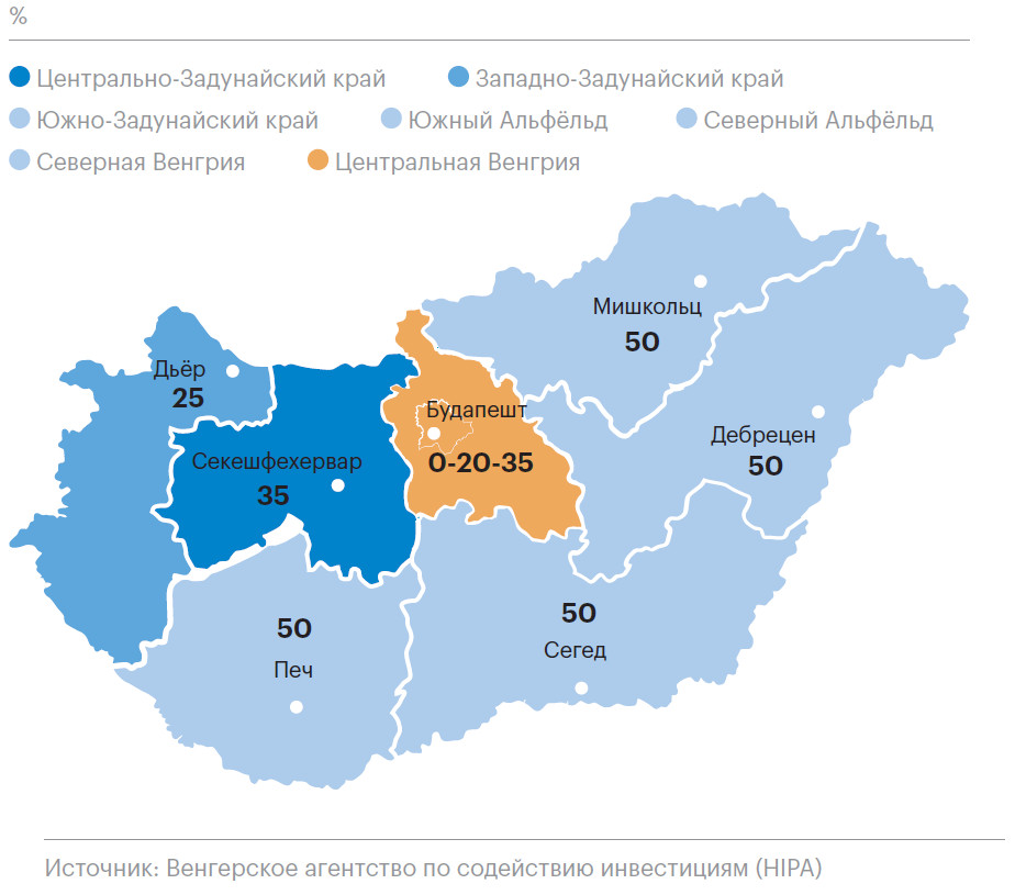 Для реинвестирования местных предприятий и привлечения иностранных инвестиций в регионы разработаны специальные меры поддержки. По данным HIPA, максимальный объем государственных субсидий — до 50% — предоставляется инвесторам в проекты на территории северных и южных регионов страны. В Западно-Задунайском крае он достигает 25%, в Центрально-Задунайском крае — 35%.