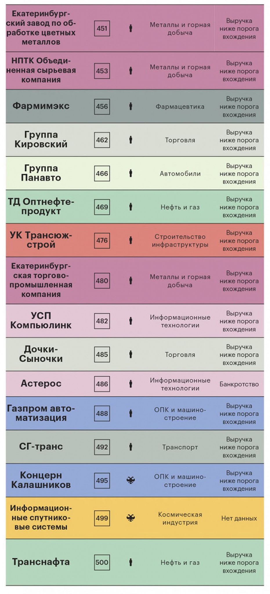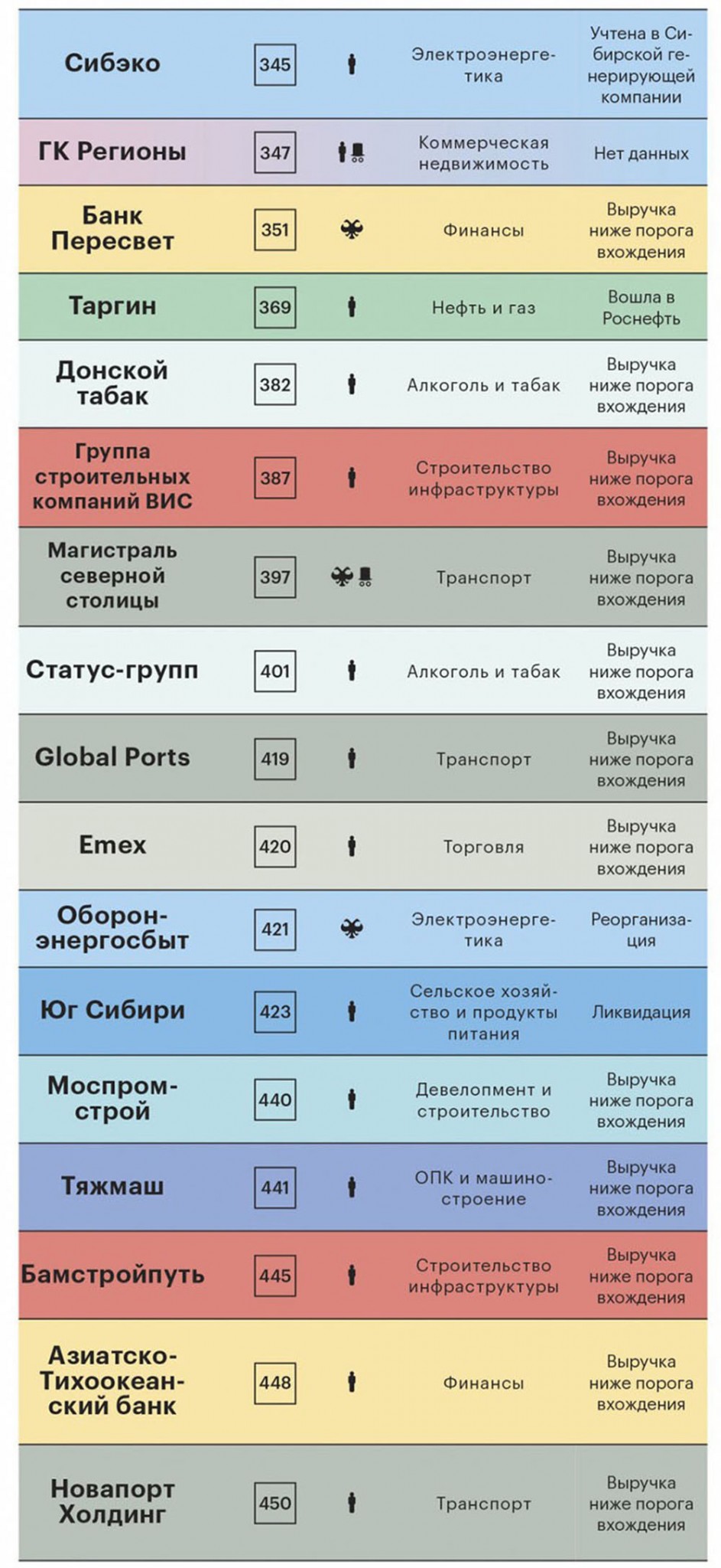 Самые крупные «потери» рейтинга — результат сделок по слиянию и поглощению: «Башнефть» вошла в состав «Роснефти», а «Северэнергия» присоединилась к «Арктикгазу». НПО «Высокоточные комплексы», создатель ракетно-пушечных и ракетно-артиллерийских комплексов («Искандер-М», «Панцирь С-1», «Игла-С») покинуло рейтинг, так как результаты его работы перестали быть публичными. У нескольких участников прошлогоднего рейтинга финансовую отчетность мы не смогли найти, использовав все доступные способы.
