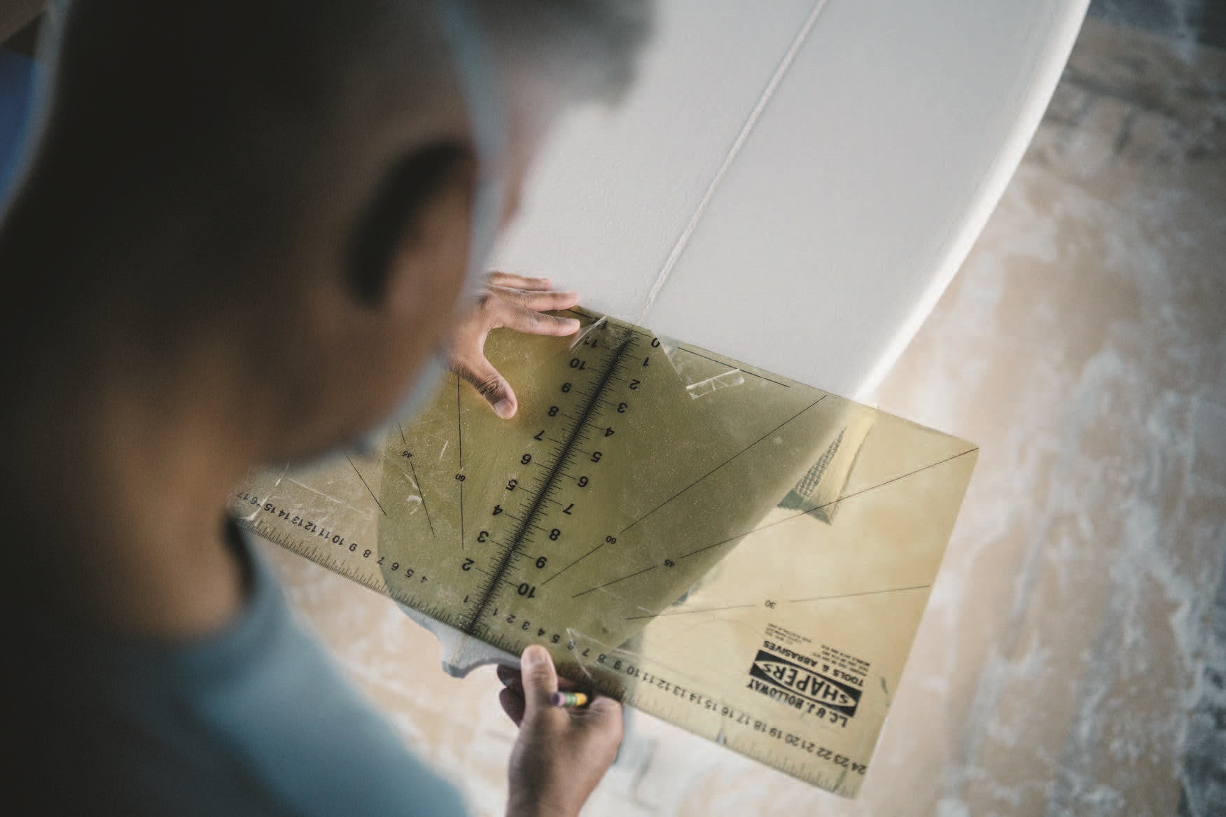 Правильные черты. Мастер делает замеры, чтобы убедиться в симметричности задней части (хвоста) доски