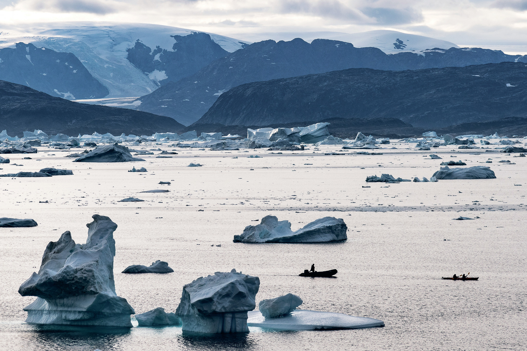 Поначалу я даже не заметил две винтовки, спрятанные среди трекинговых палок и прочего снаряжения в носовой части лодки. Зачем огнестрельное оружие на восточном побережье Гренландии в усеянном айсбергами фьорде Сермилик? Наша группа в неоново-оранжевых костюмах дрейфует мимо безжизненных ледников, многие из которых даже названия не имеют. Лодка причаливает к широкому песчаному пляжу. Утром прилив выбросил сюда сине-белые глыбы льда, но уже после полудня их унесёт обратно в море. Наши два гида вынимают винтовки из чехлов и тихонько сходят с лодки. Оказывается, ружья предназначены для защиты от белых медведей. Мы ждём на борту, наблюдая за полётом кайры, пока не слышим по рации: «Всё в порядке». Сойдя на берег, мы таращимся на айсберги и садимся на пикник в этом недолговечном парке ледяных скульптур.