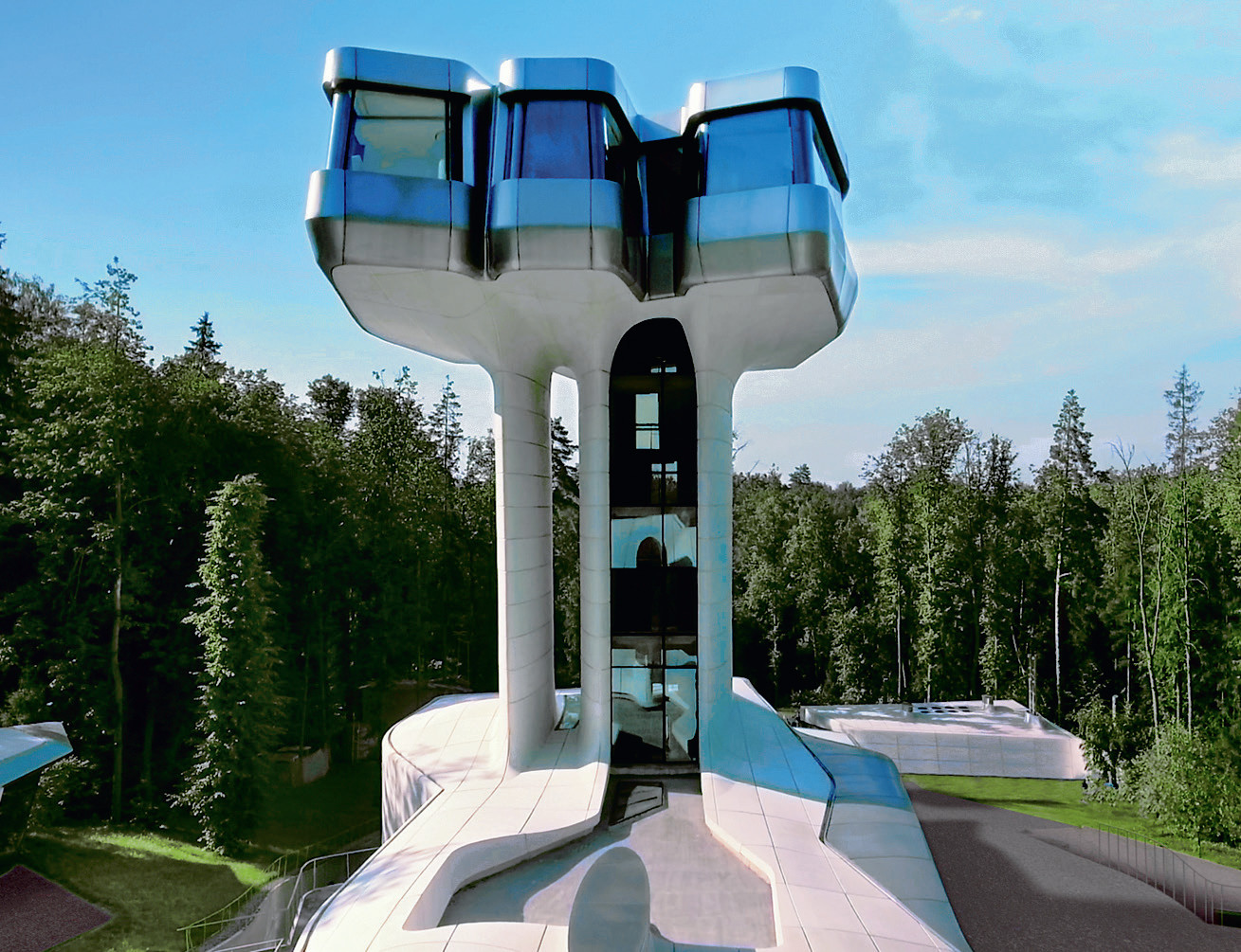 Для частного дома Владислава Доронина Capital Hill Residence архитектор Заха Хадид подняла главную спальню выше 35 метров, чтобы из неё открывался вид поверх деревьев.