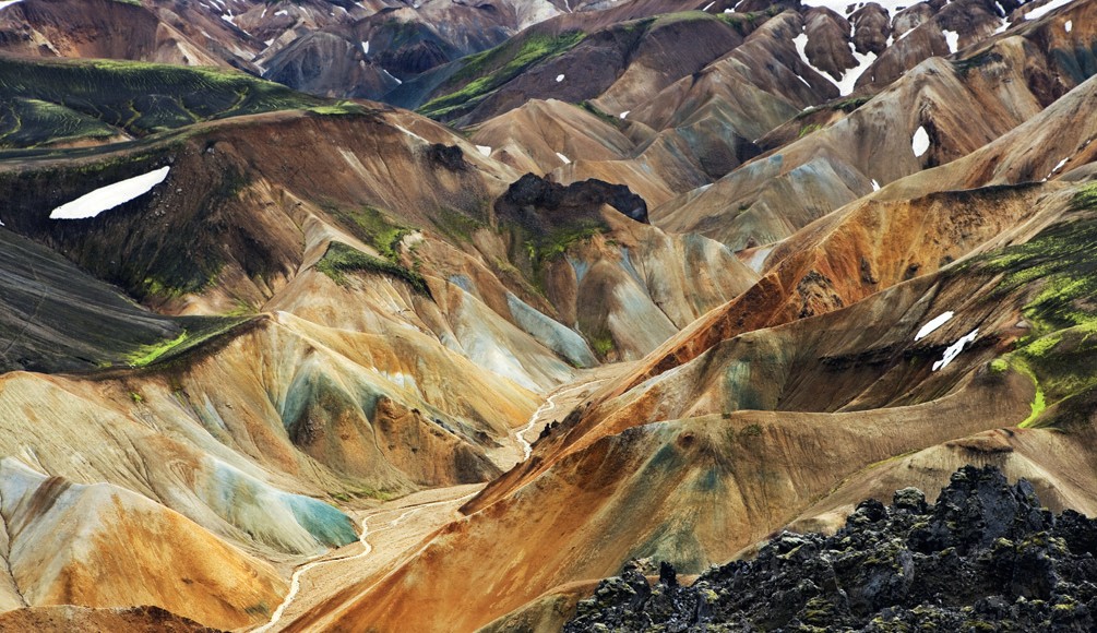 Радуга, танцующая в струях гейзеров, словно бы прилегла на горы, что добавило экзотики космическим пейзажам с поросшими лишайником склонами и лавовыми полями. Молодые и горячие вулканы Страны льда породили риолитовые породы с разнообразными включениями цвета. Добраться до гор можно только на джипе, съехав с асфальтированной трассы номер один.