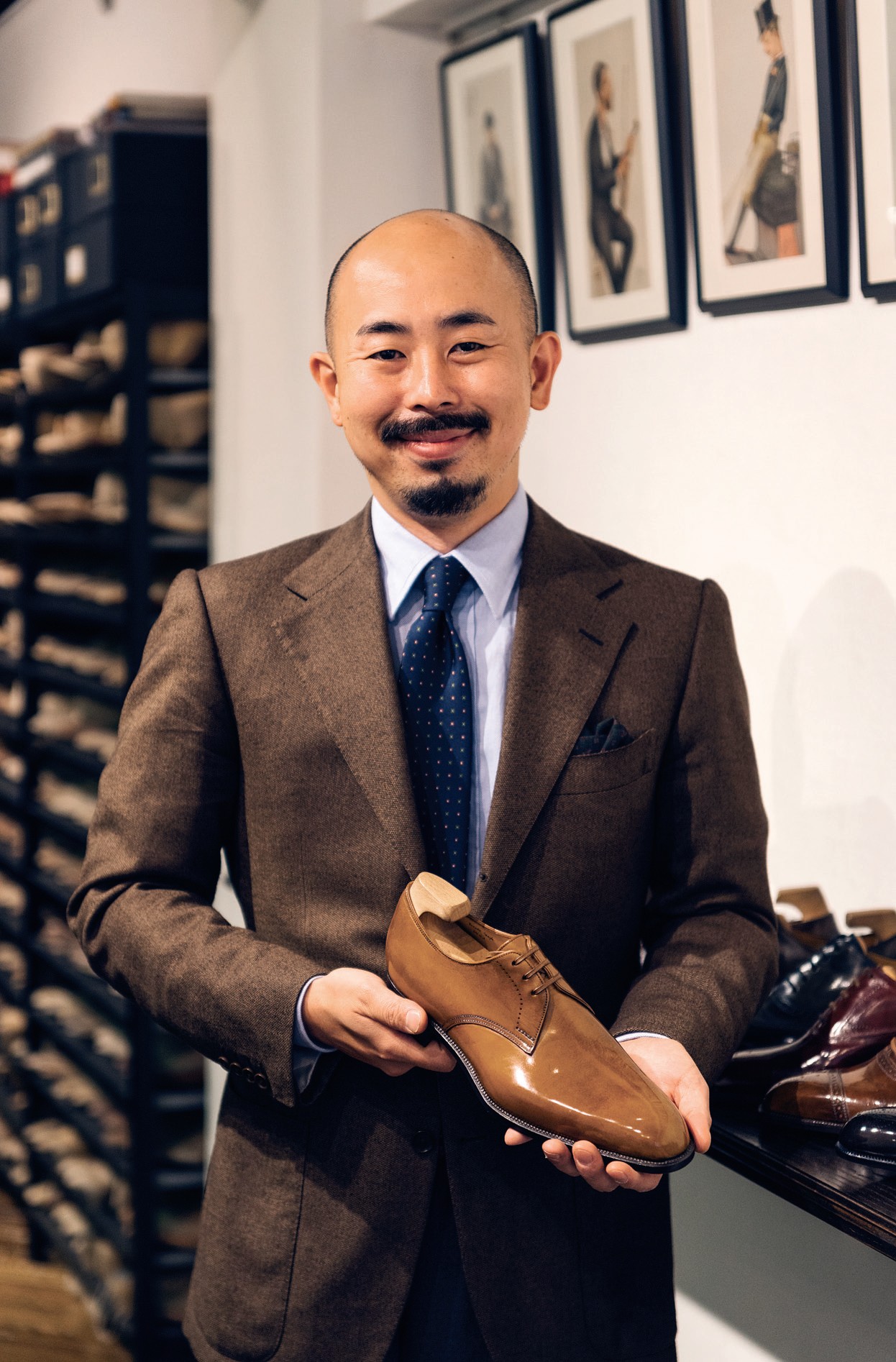 Если подняться по узкой лесенке элегантного здания в квартале Аояма, попадёшь в царство Йохеи Фукуды, достойнейшего обувщика Азии, если не мира. Улыбчивый, внимательный Йохеи с опрятной бородкой клинышком проходил обучение у Edward Green в английском городе обувщиков Нортгемптоне, а затем работал в одном из лучших лондонских обувных бутиков George Cleverley. Собственную компанию он основал в 2008 году, делая обувь на дому, а в 2011-м открыл магазин в Аояме. Теперь у него самого ученики