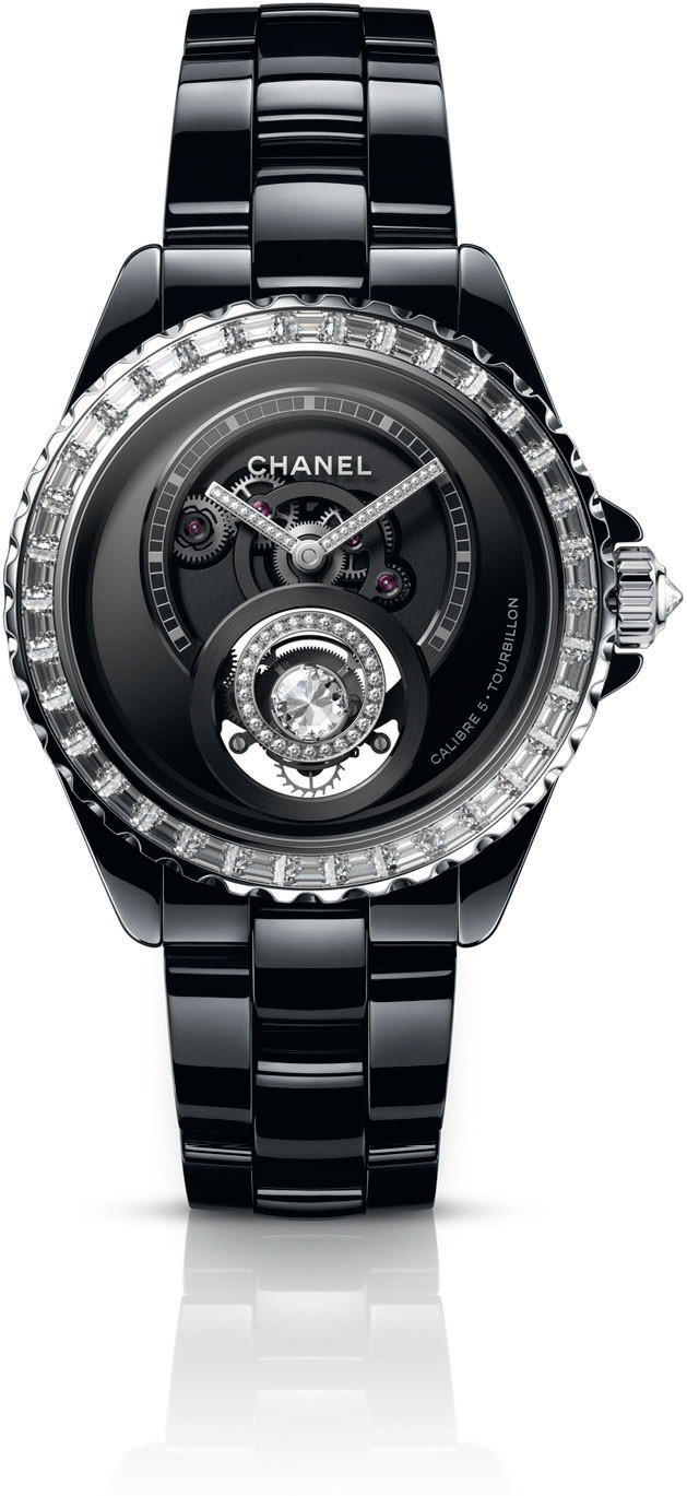 Поклонникам турбийонов и бриллиантов стоит обратить внимание на премьеру от Chanel — J12 Diamond, оснащённую новым мануфактурным механизмом Calibre 5 (на самом деле он четвёртый по счёту, просто цифру «4» Chanel считает несчастливой). Его особенность в том, что сама каретка покрыта бриллиантовой инкрустацией и увенчана крупным солитером. Всего будет выпущено 55 экземпляров в универсальном корпусе 38 мм из чёрной керамики.