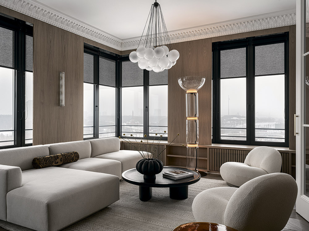 В основу планировочного решения легла философия васту — древняя индийская наука о гармонии в пространстве и месте человека в нём. Согласно этому учению, сквозь пространство дома проходят потоки энергии — важно правильно их направить. «Проектируя будущий интерьер, мы представляли открытые, лёгкие пространства, — рассказывает Екатерина. — Свободная планировка позволила расположить функциональные зоны по анфиладному принципу: комнаты открываются одна за другой, и, повернув от входа направо, можно пройти всю квартиру, вернувшись к началу. А можно следовать за светом — и сразу попасть в самую красивую видовую точку квартиры, в кабинет. При этом окна не считаются панорамными — высота подоконников составляет 40 см от пола. Мы использовали эту особенность в свою пользу и установили широкие подоконники