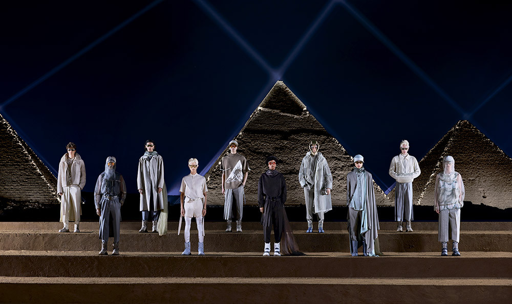 Показ семидесяти пяти мужских образов (по числу лет с момента основания Кристианом Диором его парижского ателье) от креативного директора Dior Кима Джонса прошёл в легендарной Гизе недалеко от Каира. Это было первое для французского Дома шоу в Египте и первый в истории ночной показ на фоне пирамид. Модели, похожие разом на космических путешественников, бедуинов и героев «Дюны», смотрелись невероятно органично в окружении древних памятников, освещённых белым светом прожекторов.