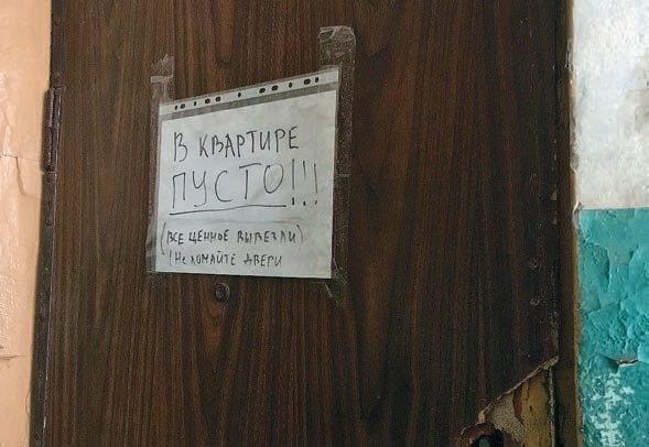 Покидая подъезд, Злата заходит к соседям. В их разбитой, распотрошенной мародерами квартире ненужными оказались советский черный дипломат и Большая советская энциклопедия. На стене висят сломанные часы с кукушкой.