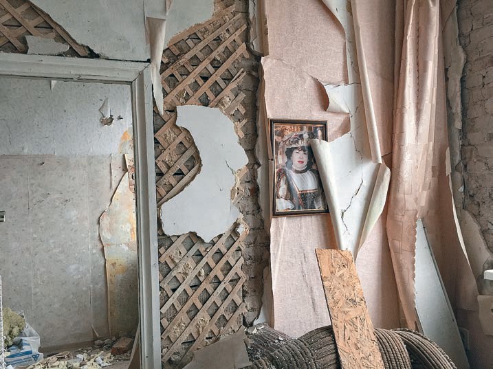 В коридоре два зеркала — сырых и глубоких — смотрят друг на друга. В зале стоит полированная советская стенка, на ее стеклянных полках хрусталь, рюмочки и стеклянная голубая сахарница в металлической подставке, густо засыпанные бетонной пылью. За съехавшей дверцей видны вешалки, на которых аккуратно развешаны мужские рубашки и пиджаки. С противоположенной обрушенной стены на все это запыленное хозяйство смотрит с портрета женщина, прикрытая лоскутами съехавших обоев. Под фотографией стоит кресло, в его глубине — скомканное оранжевое одеяло. Тут сидел отец Златы,когда прилетел снаряд. В той комнате, куда он прилетел, сохранилась книжная полка, и книги на ней стоят целенькие в ряд, тщательно подобранные по цветам. Полка и светильник с белой головкой, похожей на крышечку от «Садов Нила», — будто островки или вспышки утраченного рая благополучного советского жилища.