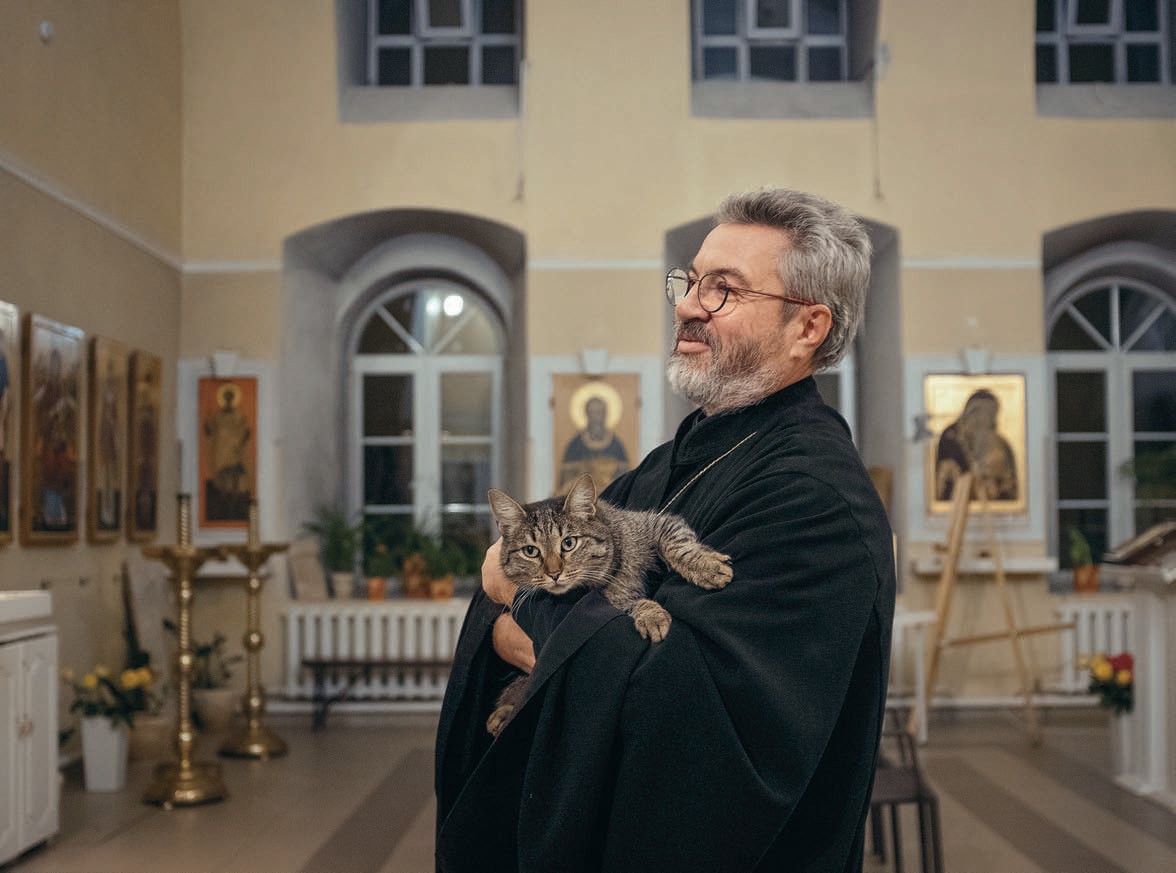 В храме отец Петр берет на руки Щербета, раньше него самого забежавшего внутрь.