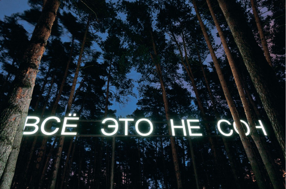 Открытие световой инсталляции Тимофея Ради «Все это не сон» привело в посадки в центре города, куда вряд ли можно было зайти вечером без опаски. Радя известен лаконичными и многосмысловыми надписями на объектах. «Тебя видно» на крыше в Екатеринбурге, или «Я бы обнял тебя, но я просто текст».
