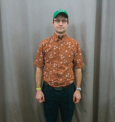 Он похож на Форреста Гампа. Рубашка в клеточку застегнута на все пуговицы, кепка, очки.
