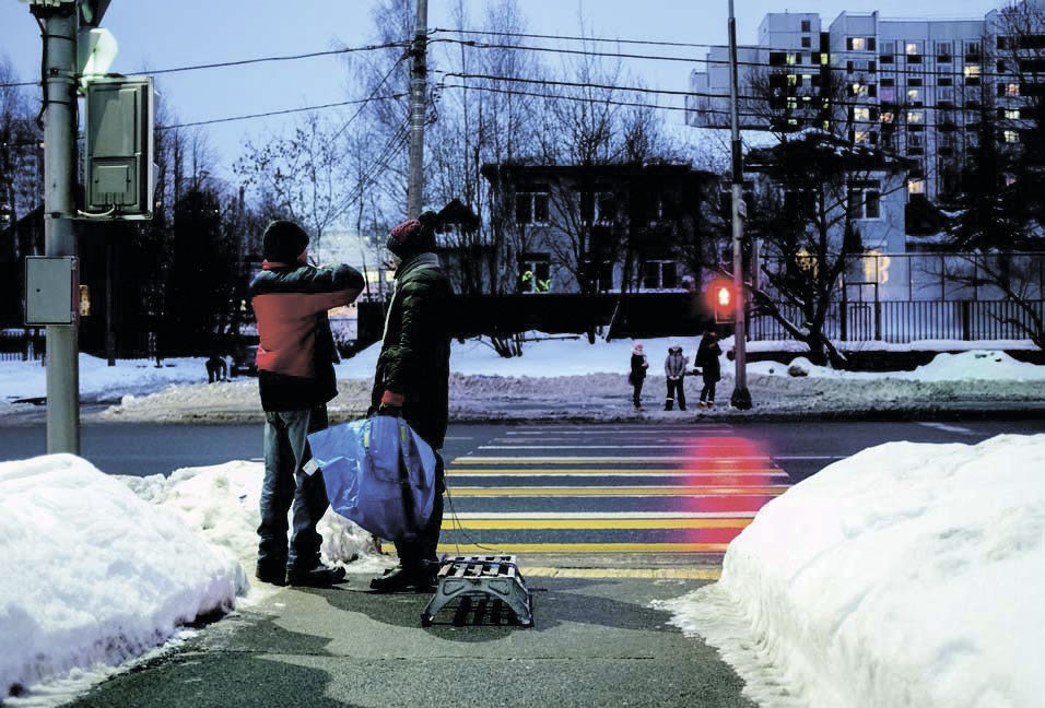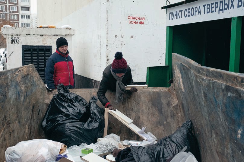 Возле трассы — торговый центр и «Макдоналдс»; их жители ближних домов посещают как будто по расписанию — в выходные. А сегодня выходные. Савелий и Светлана Викторовна, опустив головы, по-деловому и достаточно быстро, чтобы никто не окликнул или не успел обратить внимание, идут между однотипных многоэтажек. Им попадаются приезжие дворники, гребущие лопатами снег. Пустая детская площадка. Обледеневшая скамейка. Кажется, что весь мир и его цивилизация, его домашние люди — для них декорация, в которую им приходится нырять в поисках чего-то жизненно важного, торопливо барахтаться здесь и выныривать назад в свою нору, пока этот давно отказавшийся от них мир не распознал в них чужих, давно выброшенных, отверженных — и не проявил к ним агрессии. Он и она доходят до огромного мусорного контейнера, на дне которого лежат доски, коробка из-под обуви, куртка и дверцы от шкафа.