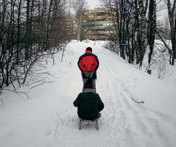 Возле трассы Светлана Викторовна прыгает на саночки, и Савелий весело тянет ее через лес к домику.