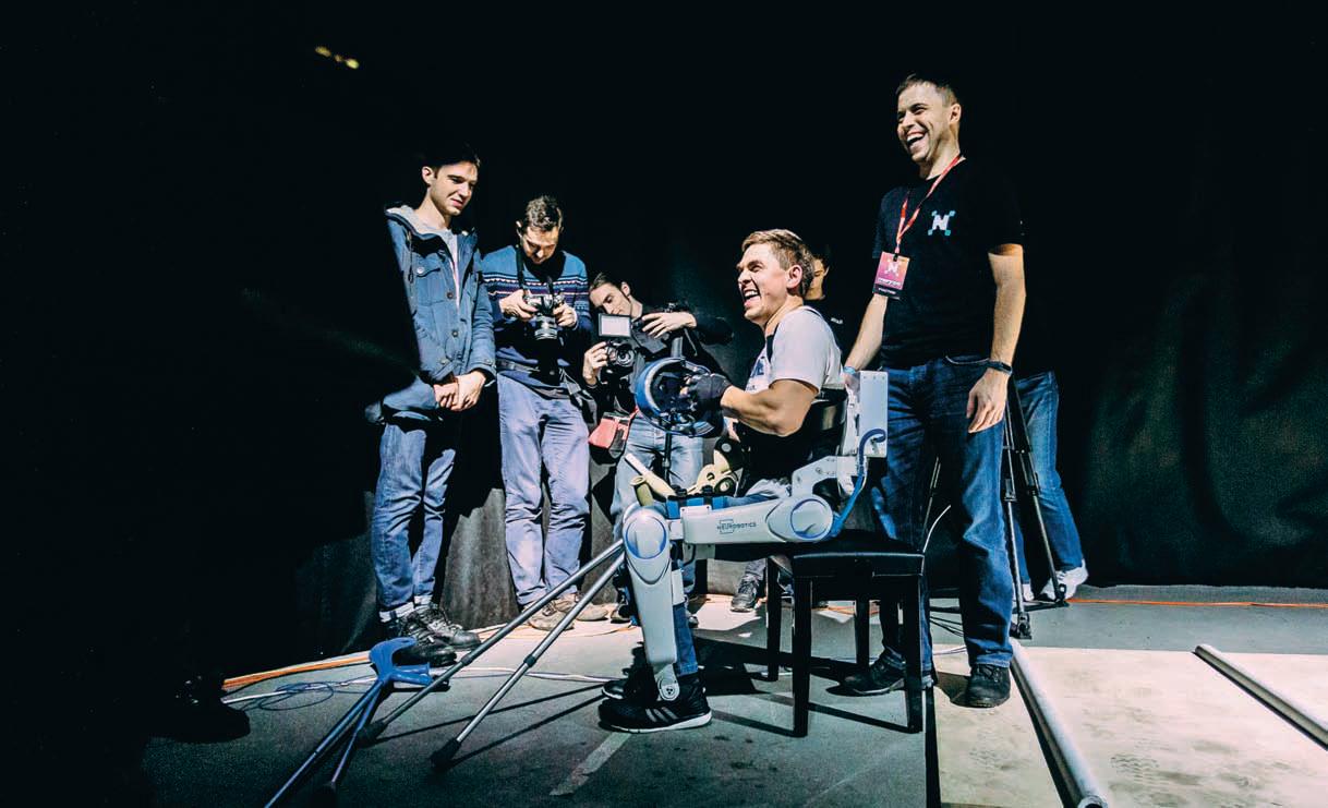 Трудно поверить, но пять минут назад супергерой сидел в инвалидном кресле, а сейчас не просто ходит — лезет в гору, удерживает равновесие на неровной дороге, забивает мяч в футбольные ворота. Денис Левин управляет экзоскелетом компании «ЭкзоАтлет». И пускай летать машина пока не умеет, зато она помогает заново научиться ходить пациентам в 35 клиниках по всей стране: в прямом смысле слова ставит на ноги людей, недавно перенесших инсульт или с детства страдающих церебральным параличом.