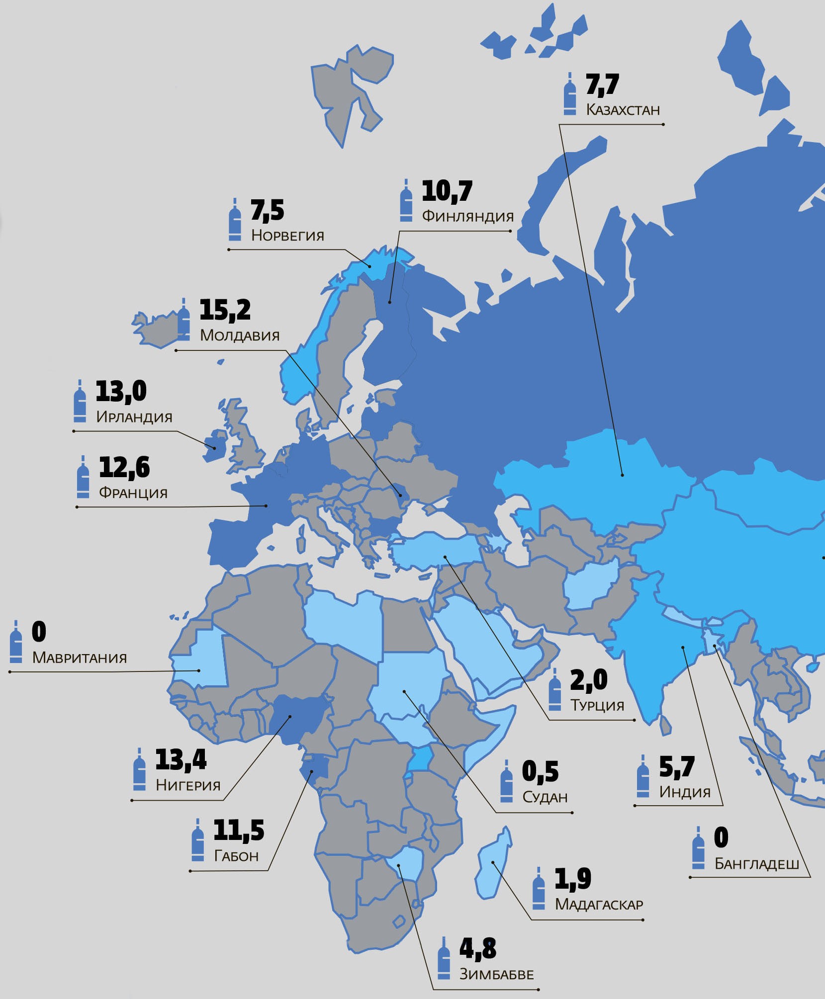 Сколько литров чистого алкоголя в среднем выпили жители разных стран старше 15 лет в 2016 году
