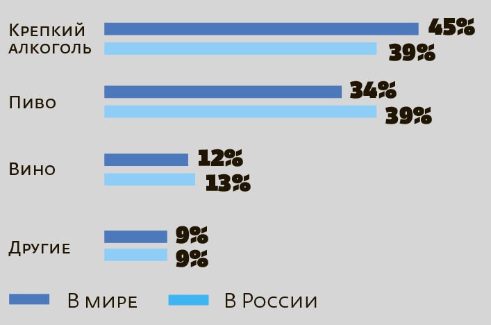 Какие алкогольные напитки употребляют в России и в мире (доля от общего количества выпитого алкоголя в 2016 году)