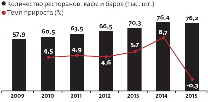 Динамика количества ресторанов, кафе и баров в России 2009–2015